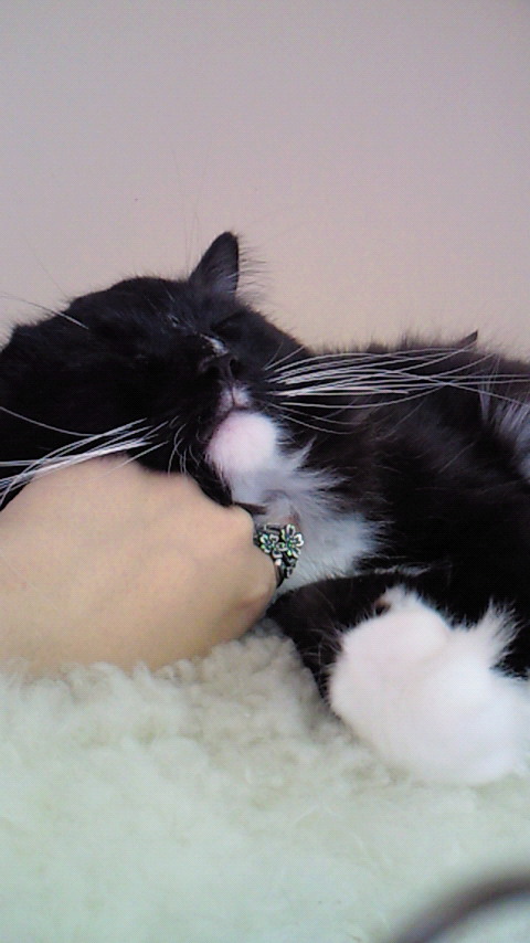 ちょうどいい高さのゲージのうえで寝てたのでアゴ撫でたりしてたらひょいっと頭をひとの手の上に・・・