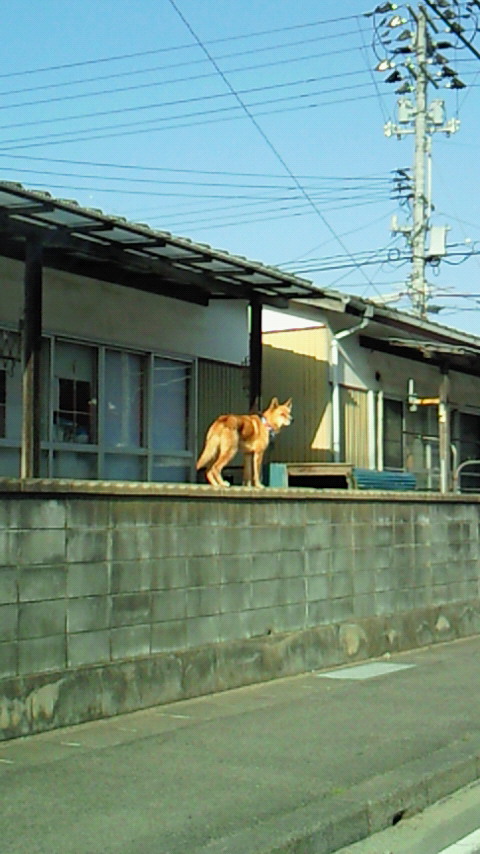 塀の上に佇む犬発見。