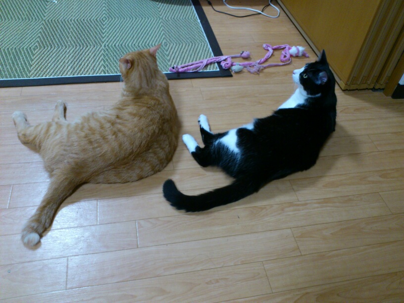 茶トラ猫ちーさまと黒白ハチワレ猫ゆうくんスコテッシュのぶのぶ